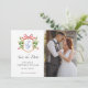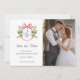 Elegant "Save the Date" wedding Photo invitation card for Holiday winter wedding featuring hand drawn watercolor crest with winter greenery and bow with the couples initials.