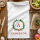 Watercolor Holly Wreath Modern Holiday Christmas hand towel. The perfect kitchen decor for the holidays. Personalise this custom design with your own monogram initial and family name.