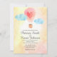 A modern and trendy wedding invitation with a watercolor textured background, featuring a pink hot air balloon with a heart design and blue clouds.