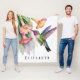 A vibrant watercolor illustration featuring a colorful hummingbird gracefully sipping nectar from soft pink and coral trumpet flowers. This elegant design showcases delicate floral details paired with iridescent feathers in shades of green, purple, blue, and gold, creating a whimsical and nature-inspired aesthetic. Perfect for spring designs, garden lovers, bird enthusiasts, and feminine artistic projects, this artwork adds a fresh, airy, and enchanting touch to any product or occasion.
