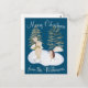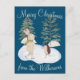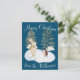 This custom Christmas or holiday postcard features a warm and cosy, snowy winter watercolor scene. Two cute little forest animals, a hedgehog and bunny, are ice skating among the trees. The background features a rich royal blue colour.