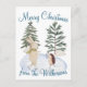 This custom Christmas or holiday postcard features a warm and cosy, snowy winter watercolor scene. Two cute little forest animals, a hedgehog and bunny, are ice skating among the trees.
