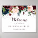 This watercolor illustrated fall wedding welcome sign is perfect for a simple wedding. The design features artistic hand-painted watercolor navy blue, burgundy, red, blush roses and peonies with elegant green leaves, inspiring the colorful idyllic autumn beauty.