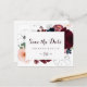 This watercolor illustrated horizontal save the date postcard is perfect for a simple wedding. The design features artistic hand-painted watercolor navy blue, burgundy, red, blush roses and peonies with elegant green leaves, inspiring the colourful idyllic autumn beauty.