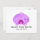 A wedding save the date postcard featuring a watercolor inspired image of a purple orchid with dark grey text below. Background is white.