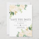 A beautifully classic wedding save the date featuring corner arrangements of watercolor roses in white and ivory, and green and gold leaves, with a touch of faux glitter. Personalise with your wedding details in grey font.