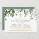 Modern Elegant First Holy Communion Invitation with cross includes ivy and fern leaves greenery. Gold Text. Sage Green Back.