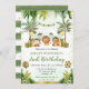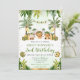 Watercolor Cute Monkey, Tiger, Zebra, Hippo and Lion design with green tropical Jungle leaves, gold borders and gold glitter confetti with green stripes background