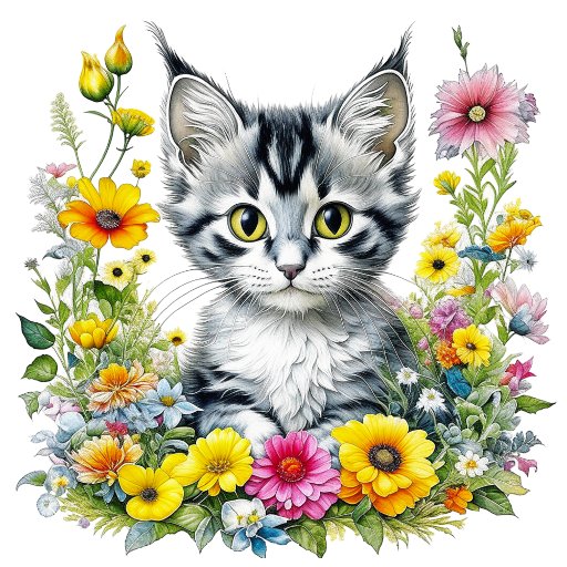 Ai art depicting an adorable cute grey kitten tabby cat surrounded by pretty yellow and pink flowers done in a watercolor style. Add name in the personalise area.