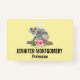 Name badge with an adorable watercolor design. Koala bear mum and baby. Baby is riding on momma's back. Standing on a tree branch. A hibiscus flower bouquet below. Banana yellow background.