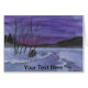 A tiny watercolor landscape of a snowy field and creek with mountains against a brilliant, evening sky.