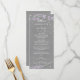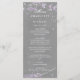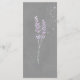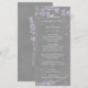 Wedding menu featuring purple lavender watercolor flowers and watercolor spatter on a grey background.