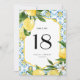 Add a touch of vibrant charm to your wedding reception with this customisable table number card, featuring a watercolor lemon design paired with a stunning white, blue, and yellow Moroccan tile pattern. The fresh lemons and bold, colourful tiles create a unique and lively accent to your table decor, perfect for setting the tone of your celebration.
