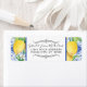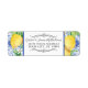 Farmhouse blue and white tile background with yellow citrus lemons and white floral leaf greenery wreath return address label with an elegance that will stand out on your wedding invitation suite presentation. Made from hand painted watercolor artwork by internationally licensed artist and designer, Audrey Jeanne Roberts. Copyright.
