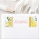 The address labels feature lemons, roses, and leaves arranged around the border. The central text displays the party details in a simple font. The colours are mainly yellow, green, and pink. The overall design evokes a garden setting.
