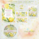 The napkins feature lemons, roses, and leaves around the border. The central text provides the party details in a simple font. The colours are yellow, green, and pink. The design evokes a summer garden setting.