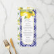 Modern citrus theme wedding dinner reception menu features lemon blossoms and blue Mediterranean tile pattern. All text, fonts, and colours can be changed. Coordinating items available to complete your wedding suite.