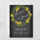 Rustic Italian farmhouse watercolor lemon foliage wreath on a chalkboard background a wedding invitation with details on the back.
