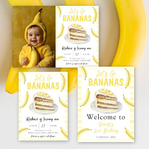 "Let's Go Bananas". Birthday Party. Invite guests to a birthday party in style with bananas cake birthday party invitations. Watercolor cake with bananas.
