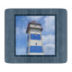 Nautical themed design with watercolor lighthouse decoration in dark blue frame. It is possible to change the background colour and to add different one to the design with your choice.