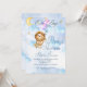 Celebrate the upcoming arrival of your bundle of joy, with our cute jungle lion in a whimsical watercolor theme. Featuring beautiful baby blues colours with stars, moon, blue clouds and cute lion flying with balloons. Personalise this gorgeous invitation with your party details easily and quickly, simply press the customise it button to further re-arrange and format the style and placement of the text. The beautiful blue theme is carried in the back as well