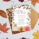 A modern and elegant pumpkin fall themed baby shower invitation featuring pumpkin, pink and yellow flowers, mushroom and autumn leaves.