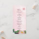 This modern Chinese wedding menu card features a watercolor lotus flower on a pink watercolor background and a pink double happiness symbol on a cream background. With custom bride and groom names, the wedding date and a custom menu text. On the backside are the initials to change.