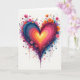 This greeting card features a large heart in the center on a white background, painted with wide, swirling strokes. The heart glows from a yellow middle and shifts outward through orange, red, hot pink, purple, and then deep blue along the edges. Around it are small, simple flowers in pink, orange, and purple, plus thin dark stems that look like they’re growing from the heart. You’ll also see scattered paint dots and drips that run down and out from the heart, giving it an energetic, artsy look. The heart feels warm and hopeful, like a big burst of affection ❤️.