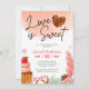 This watercolor bridal shower invitation features a charming cupcake and a chocolate chip cookie in the shape of a heart, with a pink watercolor background and a sweet, playful font that reads "Love is Sweet." This design is perfect for a bridal shower that's fun, romantic, and full of love. The invitation is easy to customise with your bridal shower details, including the bride's name, date, time, location, and RSVP information.