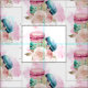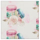 Fabric with a delightful image. 3 colourful macarons, pink, green and blue with a fancy rose floral bouquet and a splash of pink watercolor behind. Delicious and stylish too! White Background.