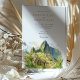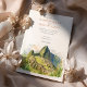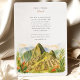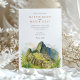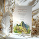 Announce your wedding with this extraordinary watercolor invitation, showcasing the majestic ancient city of Machu Picchu in Peru. The front presents the ruins, its surrounding mountain peaks, rendered in a soft, artistic watercolor style. The background features touches of the cloudy, mountainous Peruvian landscape. Framing the beautiful scene are lush green foliage.