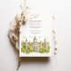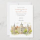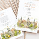 Celebrate your special day with this exquisite wedding invitation, showcasing the iconic architecture of Madrid, Spain. The front presents a picturesque view of the city, with its elegant buildings, domes, and towers, rendered in a soft, artistic watercolor style. Lush greenery frames the scene, adding a touch of natural beauty.