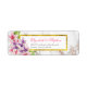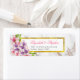 A fancy set of wedding, return address labels with a modern design. A faux marble texture in white makes up the background. Layered over top is a frame with a faux gold foil border. Large pink and purple watercolor magnolia flowers with green leafy accents the corner.