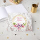 A wedding guestbook with a modern design - with an elegant background made with a white (faux) marble texture. Layered over top is a circular frame with a gold decorative border. Large pink and and purple watercolor magnolia flowers with green leafy accents decorate the design. Personalise with your names and wedding date.