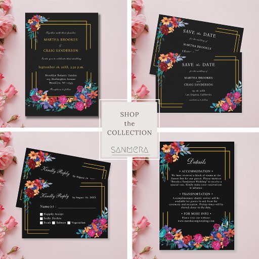Watercolor Mexican Fiesta Flower Wedding Invitation. We love bright colours and bold designs, so we want something that would be fun and whimsical but still classy enough for a wedding. This invitation has an abundance of colourful flowers and modern typography on a black background for a sophisticated floral look - that would fit in all year-round wedding.
