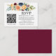 Modern Watercolor Floral Wedding RSVP Card with your QR Code includes includes golden yellow, peach, blue, burgundy red flowers roses and botanical greenery. Burgundy Back.