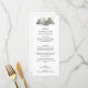 Serene watercolor mountains menu card with trees.