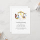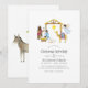 Nativity Christmas party invitation card featuring baby Jesus, Mary, a manger, an angel, Joseph and the Star of Bethlehem.