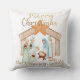 This custom throw pillow features a watercolor painting style religious theme. An image of the Nativity Scene, with baby Jesus, May, Joseph, and the three wisemen are pictured standing in the manger. The greeting "Merry Christmas" is printed in an elegant faux gold foil above the illustration. A sample family name is printed below which you can personalise to include your own family name or other custom text.