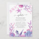 Whimsical pink and blue ocean themed beach postponed wedding announcement featuring sea ferns, seaweed, coral, shells and starfish designed to be quickly and easily customised to your event specifics.