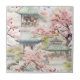 This ceramic tile captures a tranquil scene featuring a traditional Asian-style pagoda set against a backdrop of blooming pink cherry blossoms. The delicate watercolor technique highlights the intricate architectural details of the pagoda while emphasizing the soft, ephemeral beauty of the surrounding sakura. Inspired by East Asian aesthetics, this piece embodies the harmony between human-made structures and nature, reflecting cultural themes of serenity and the transient nature of life.