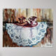 A lovely watercolor of a rustic shelf with vintage tea cups on and old white lace linen. On the background stands an old wood wall. This painting is from my still life collection,