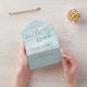 This elegant wedding invitation features a calming blue and tan beach watercolor background on the inside, capturing a soft, slightly abstract view of the shore as it meets gentle ocean waves for a relaxed coastal feel. The outside of the card is a solid teal blue, providing a striking and modern contrast.