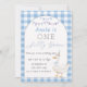 Celebrate your little one's first birthday with this delightful and whimsical invitation! Featuring a sweet goose wearing a festive party hat and bow, paired with playful pastel bunting, this design sets the tone for a fun and memorable gathering. The bleu and white chequered background adds a fresh and cheerful touch, making this invitation perfect for a cosy, laid-back celebration. 🎈✨