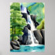 Watercolor painting of a cascading waterfall. A landscape with stones and trees.