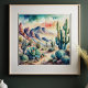 Watercolor Painting of Rural Desert Landscape Cactus. The aspect ratio is 1:1. It was designed to be printed as 20"x20" 16"x16" 12"x12"