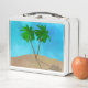 Lunch box patterned with a beach scene of tropical palms, sand and sky made from a digital collage of watercolor and patterned images