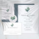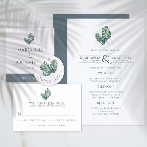 A modern, elegant, minimalist design with fresh green watercolor monstera palm leaves accented with slate grey.