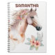 A beautiful watercolor painting of the head of a Palomino coloured horse that has a light grey mane with pastel pink and orange flowers in it set against a stark white background. The equine is framed by a corner pastel wild flower bouquet and a template for your name appears at the top in brown with a faux pink drop shadow. Ideal for horse lovers and equestrian fanatics.