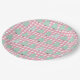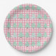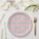This adorable Christmas paper plate features an assortment of whimsical, pastel Christmas trees on pink plaid background.
